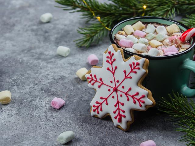 Wallpaper A cup of hot drink with marshmallows on the table with cookies