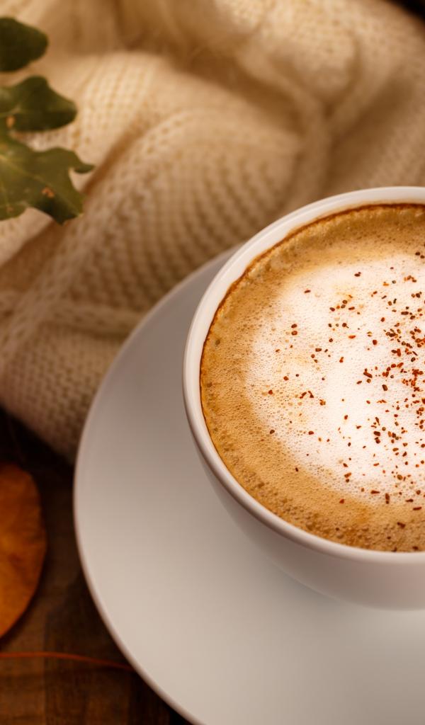 Wallpaper White cup with delicious coffee on the table with yellow leaves
