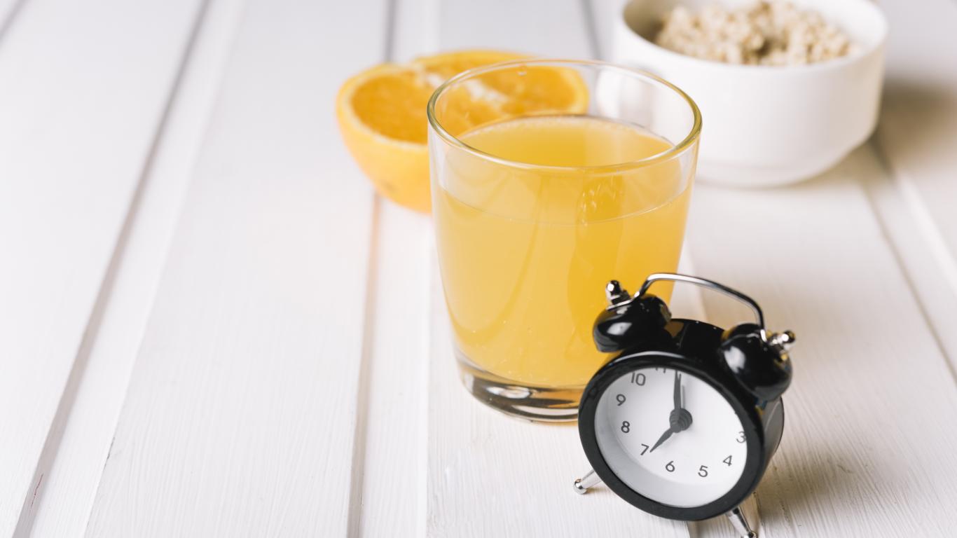 Wallpaper Black alarm clock on the table with a glass of juice and cereal