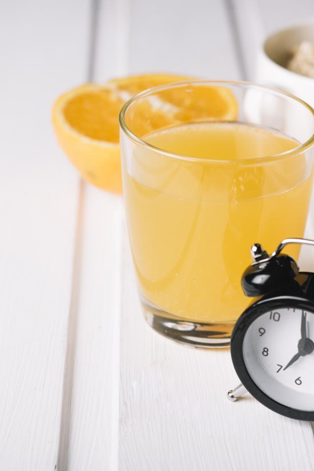 Wallpaper Black alarm clock on the table with a glass of juice and cereal