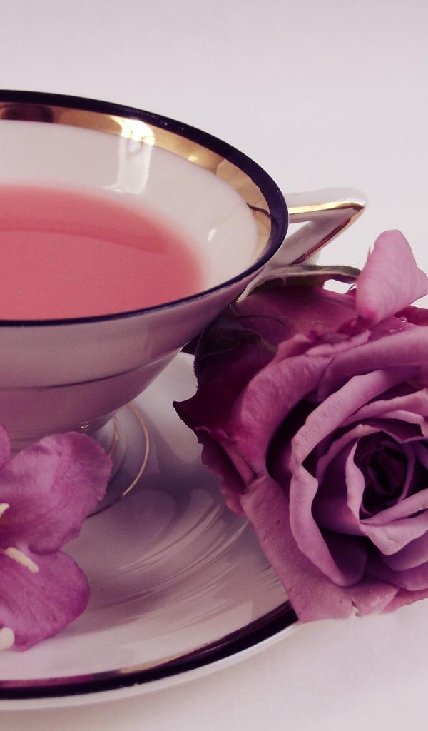 Wallpaper Cup of tea on a plate with a rose and bells on a gray background
