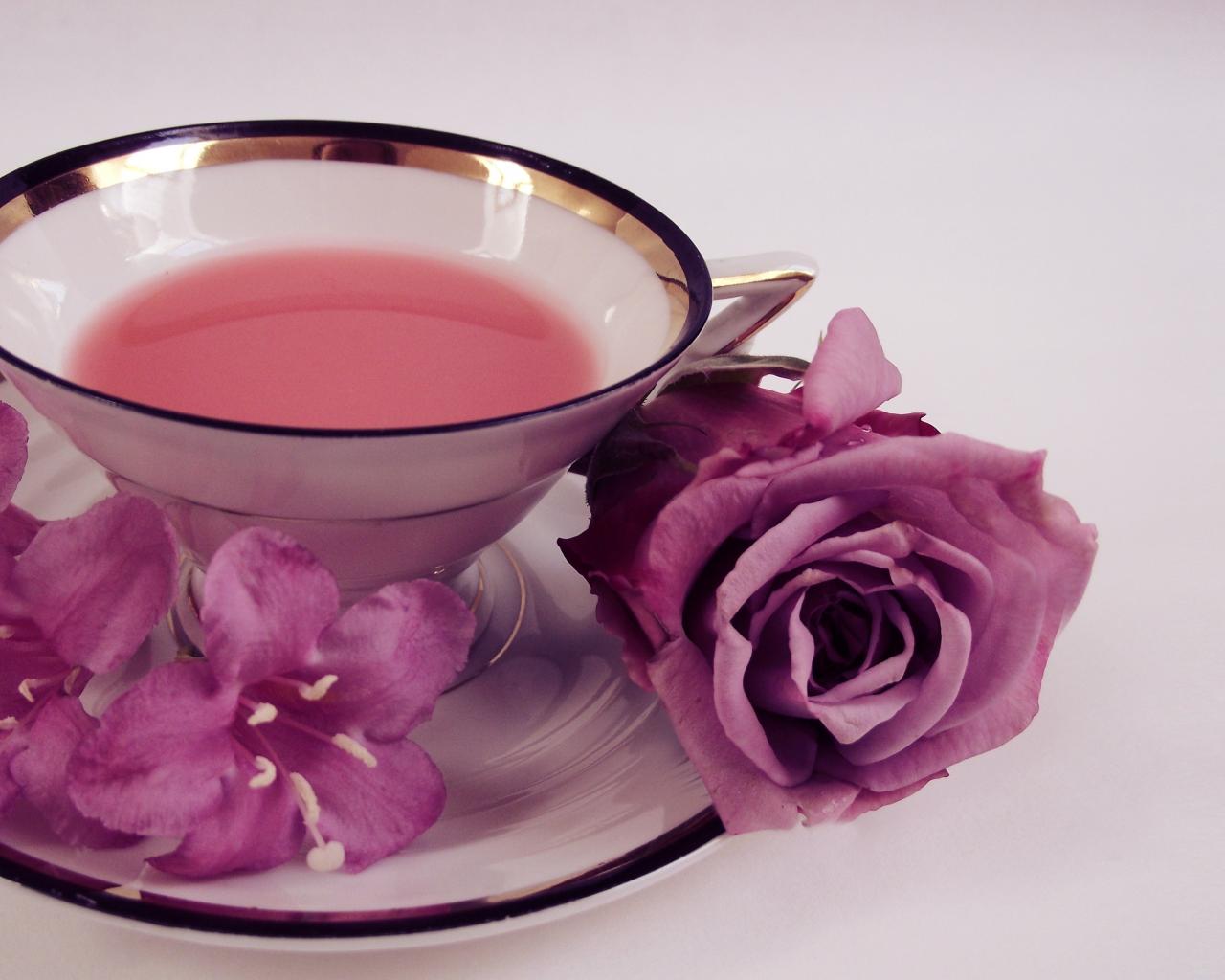 Wallpaper Cup of tea on a plate with a rose and bells on a gray background