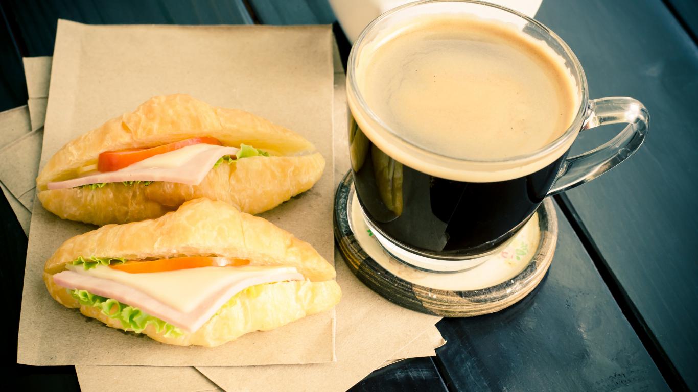 Wallpaper Glass cup of coffee on the table with sandwiches