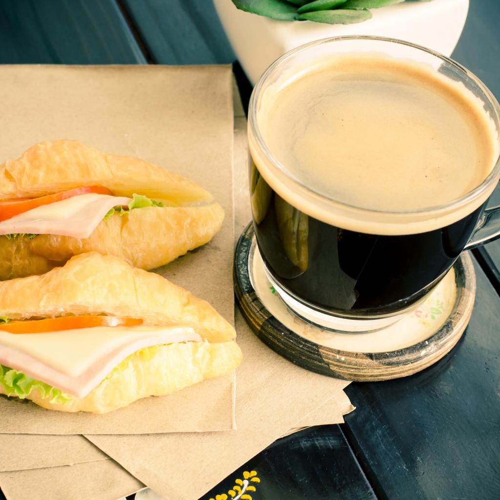 Wallpaper Glass cup of coffee on the table with sandwiches