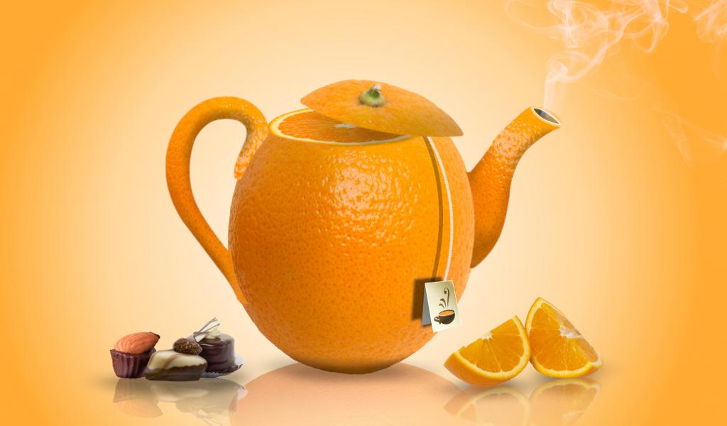 Wallpaper Orange teapot on orange background with candies