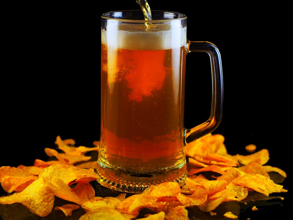 Wallpaper Glass of beer with chips on a black background