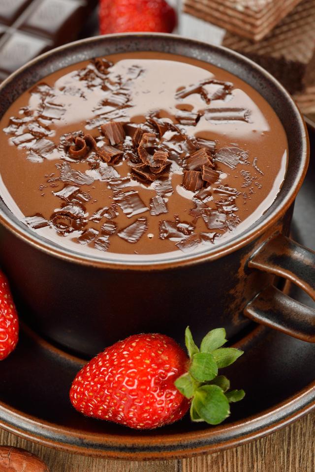 » Wallpaper Hot chocolate in a cup on the table with strawberries