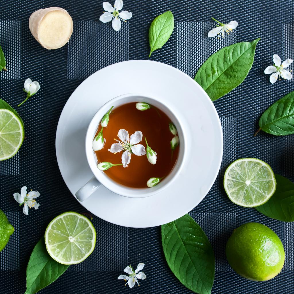 Wallpaper White cup with tea on the table with lime and green leaves