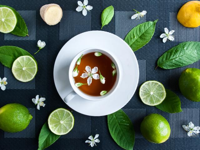 Wallpaper White cup with tea on the table with lime and green leaves