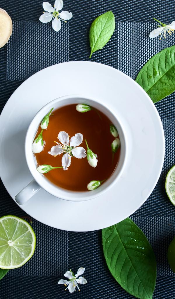 Wallpaper White cup with tea on the table with lime and green leaves
