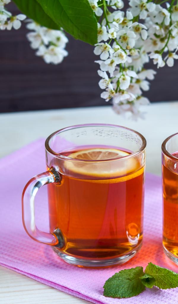 Wallpaper Two cups of tea with lemon on the table with flowers