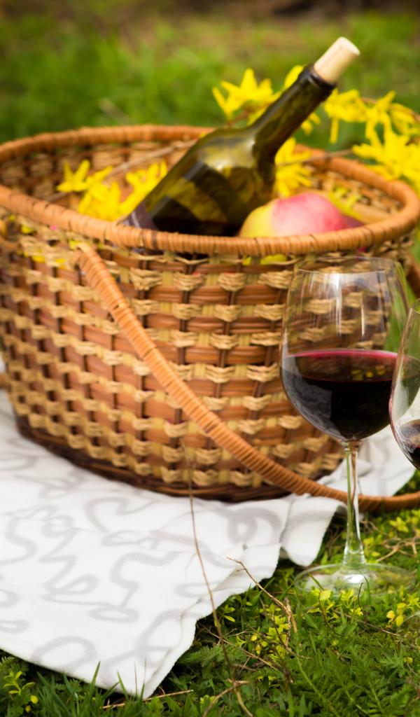 Wallpaper Two glasses of wine with a picnic basket on the green grass
