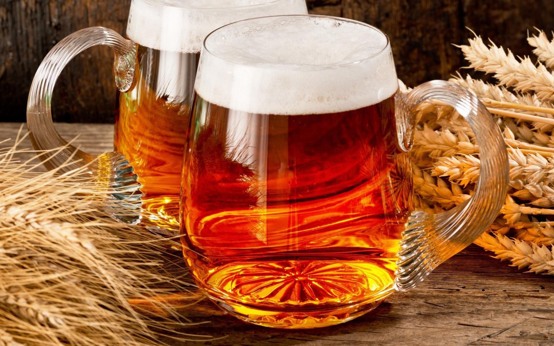 Wallpaper Two glasses of beer on the table with ears of wheat