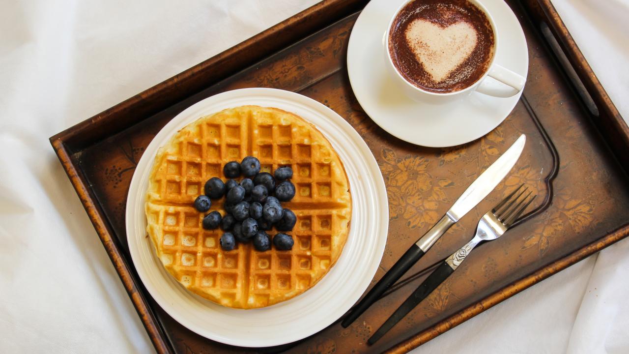 Wallpaper Cappuccino in a cup on a tray with waffles and blueberries