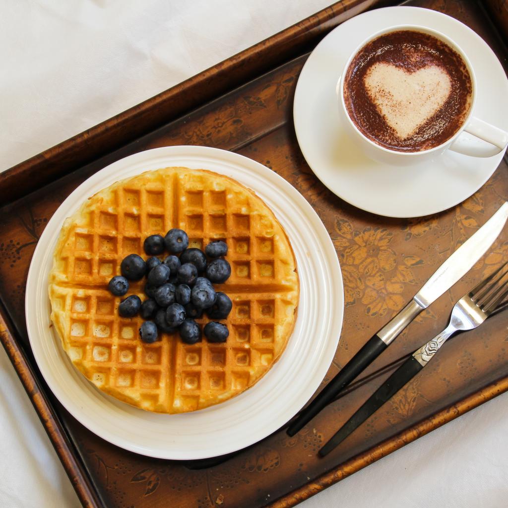 Wallpaper Cappuccino in a cup on a tray with waffles and blueberries