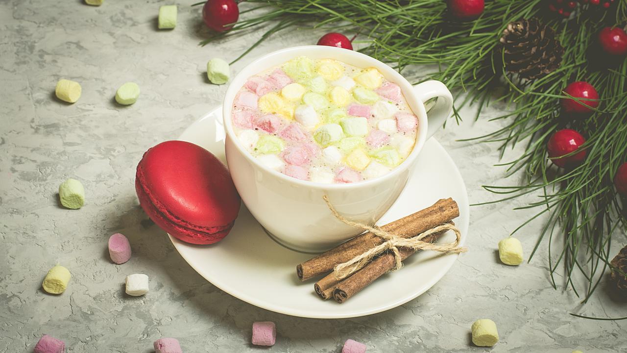 Wallpaper Drink with marshmallows on a saucer with macaroon and cinnamon