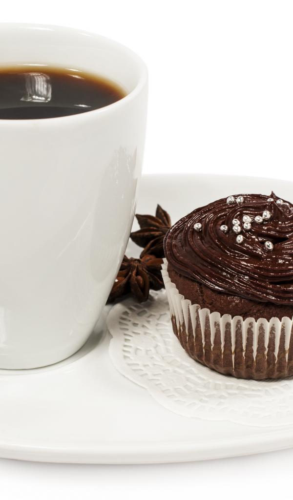 Wallpaper A cup of coffee on a white plate with a cupcake and cinnamon