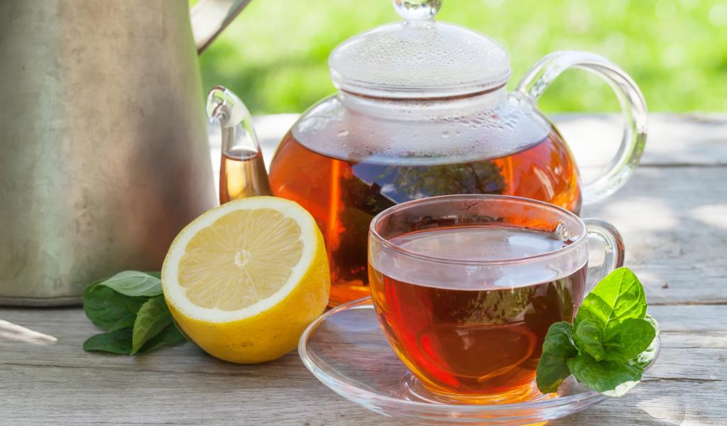 Wallpaper Teapot with tea on the table with a cup and a half of lemon