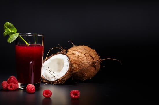 Wallpaper A glass of juice on the table with coconut and raspberries