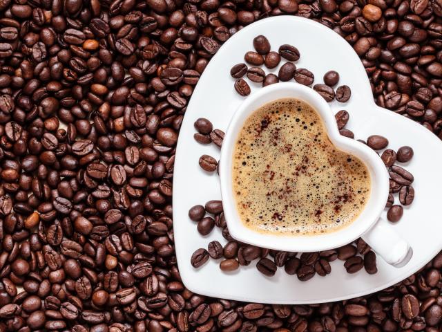 Wallpaper White cup in the shape of a heart stands on coffee beans
