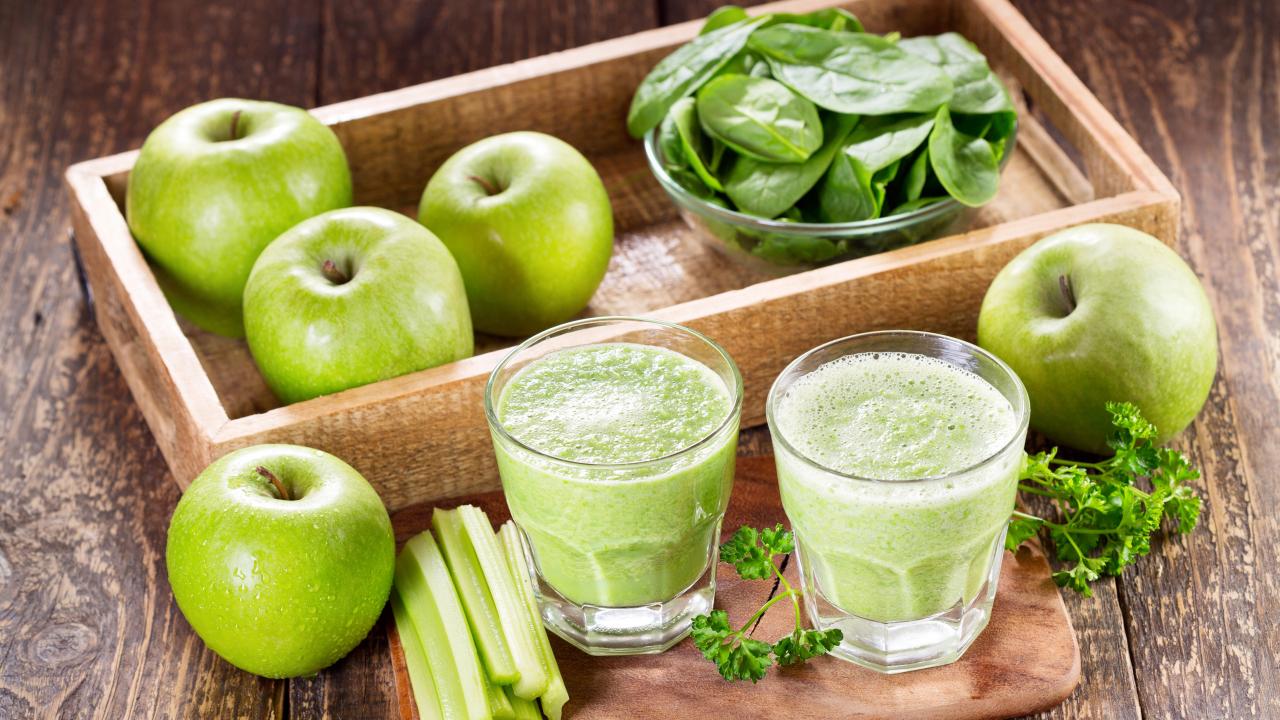 Wallpaper Smoothies on the table with green apples and greens