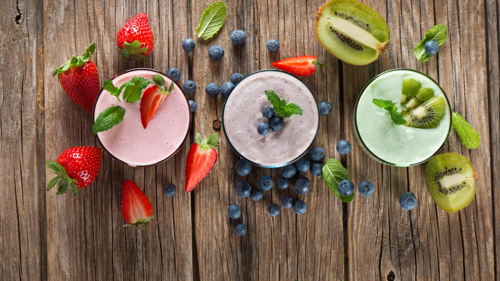 Wallpaper Smoothies on the table with kiwi, strawberries and blueberries