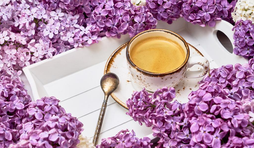Wallpaper Cup of coffee on a tray with lilac flowers