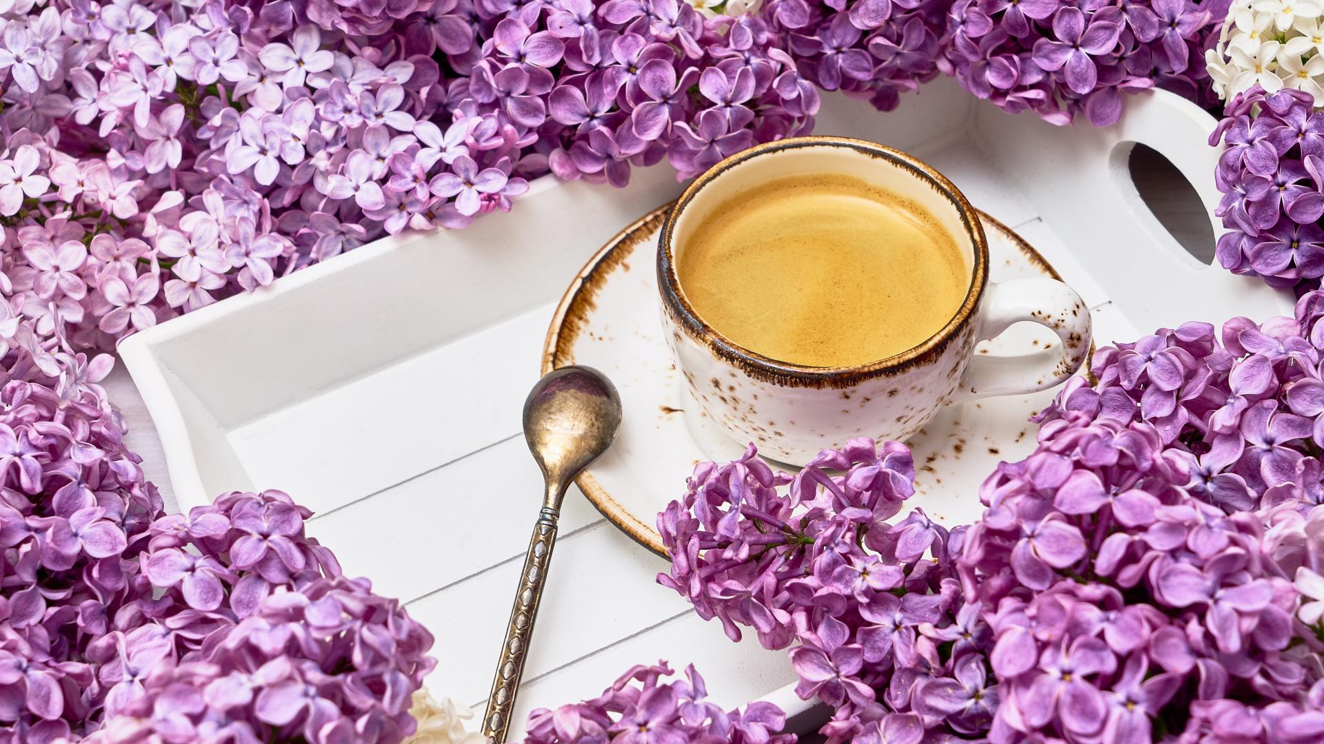 Wallpaper Cup of coffee on a tray with lilac flowers
