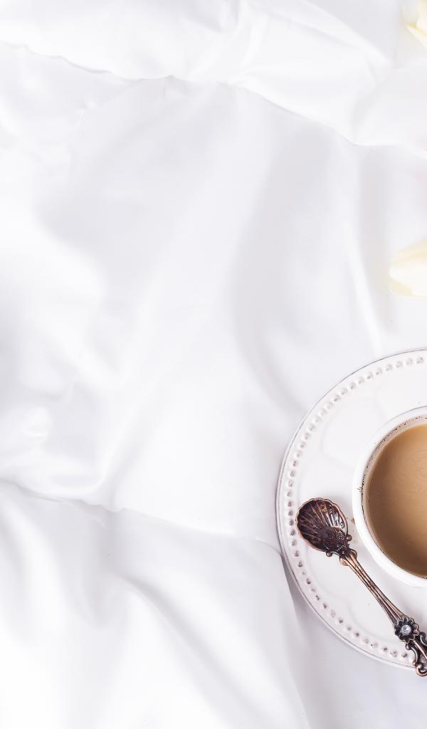 Wallpaper A cup of coffee on a white bedspread with tulips
