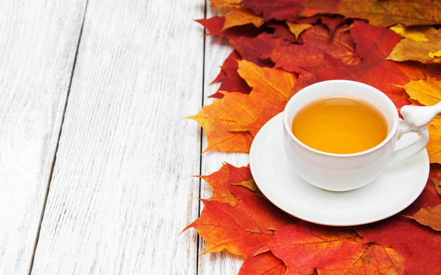 Wallpaper Cup of tea on a table with autumn foliage