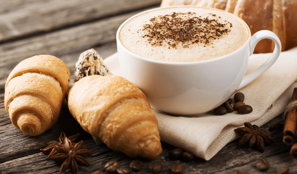 Wallpaper Cup of cappuccino on a table with croissants