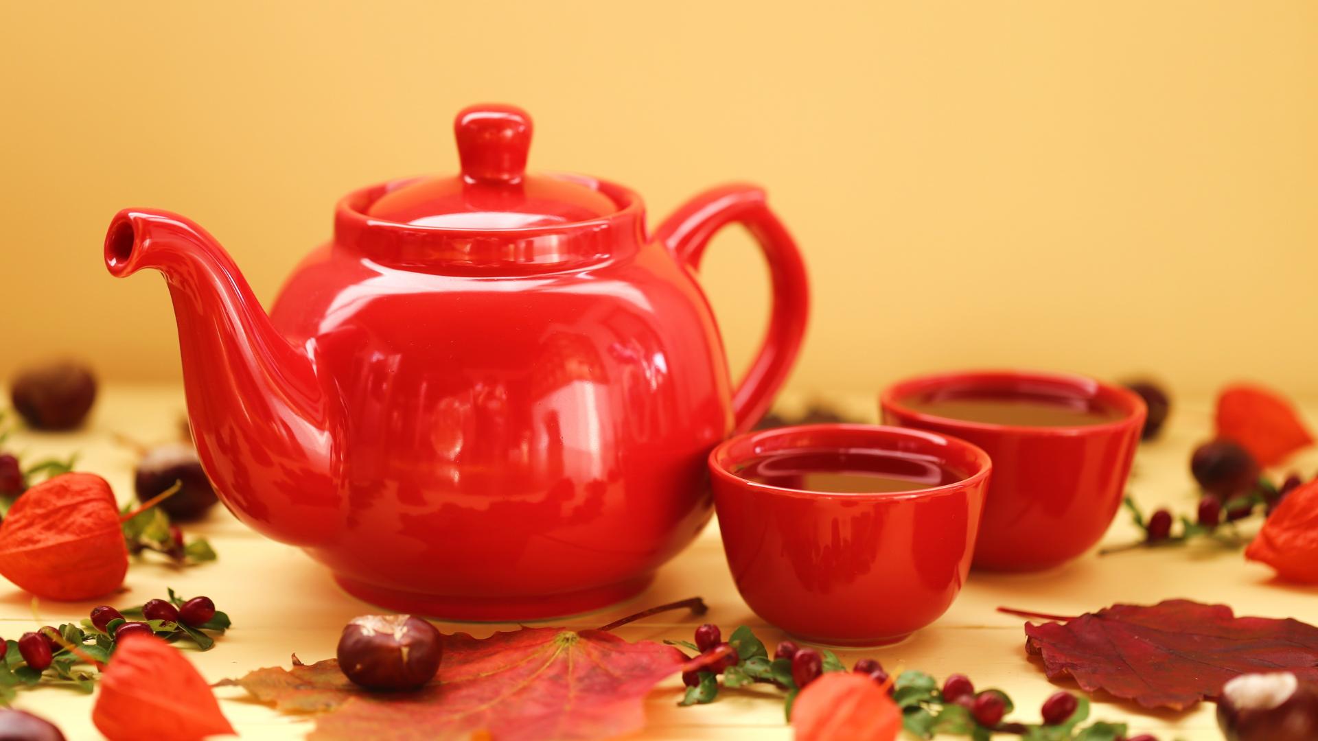 Wallpaper Red teapot with cups on the table in autumn