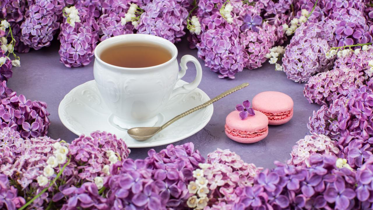 Wallpaper Cup of tea on a table with lilac flowers and pasta dessert
