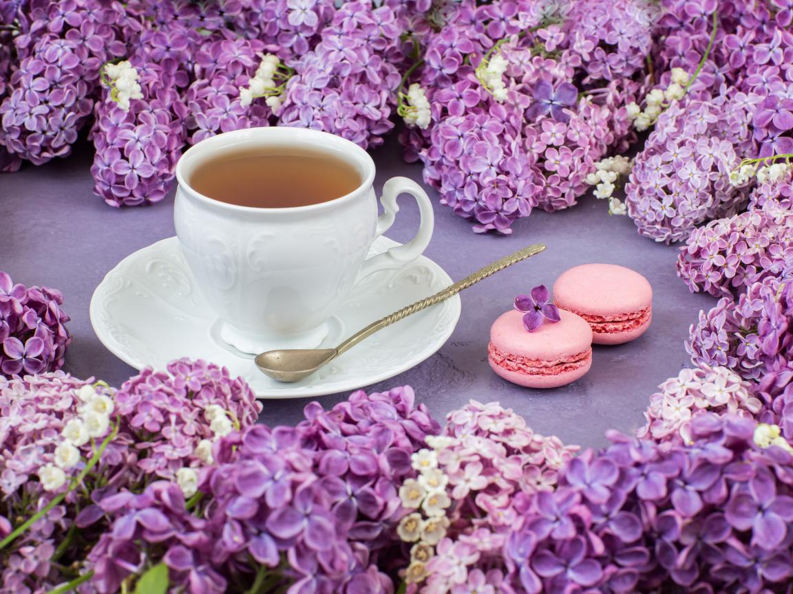 Wallpaper Cup of tea on a table with lilac flowers and pasta dessert