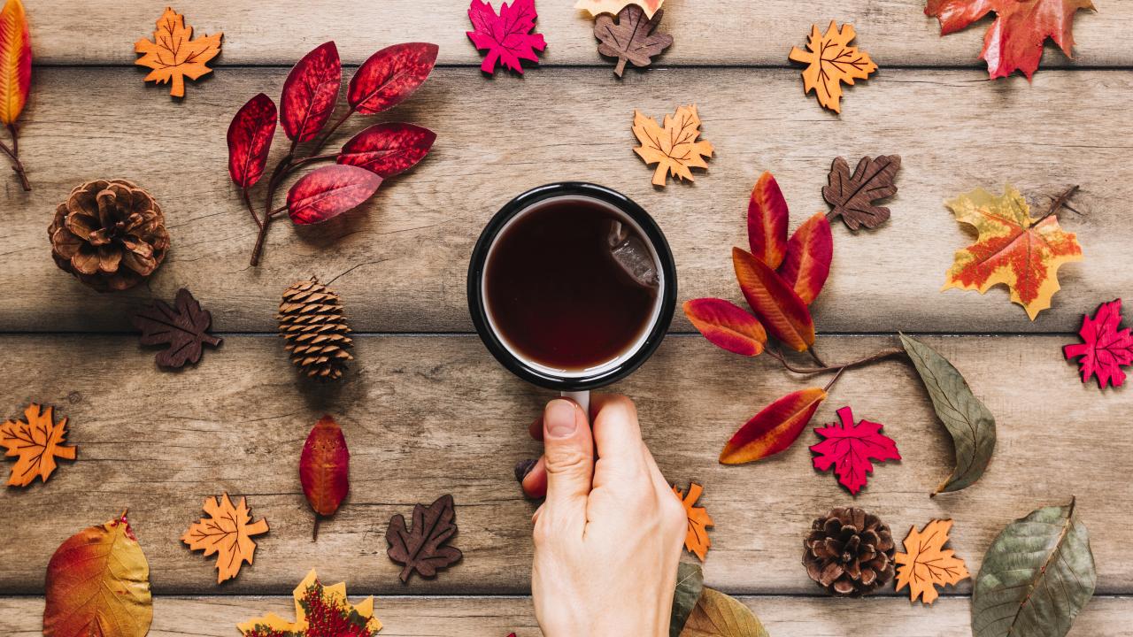 Wallpaper Mug of tea on the table with autumn leaves