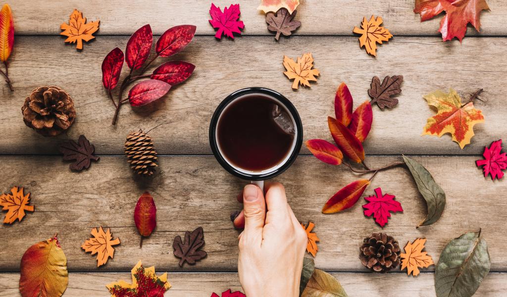 Wallpaper Mug of tea on the table with autumn leaves