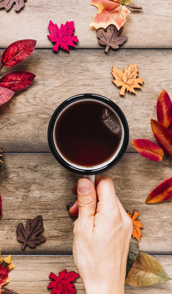 Wallpaper Mug of tea on the table with autumn leaves