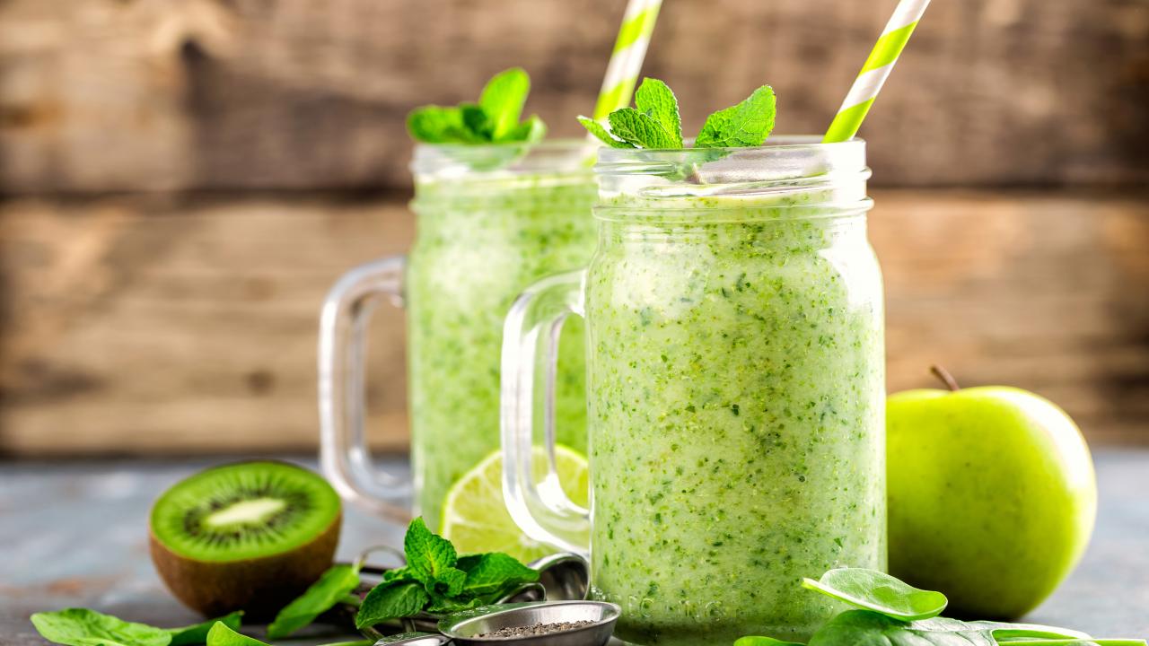 Wallpaper Two green smoothies on a table with kiwi, mint and a green apple