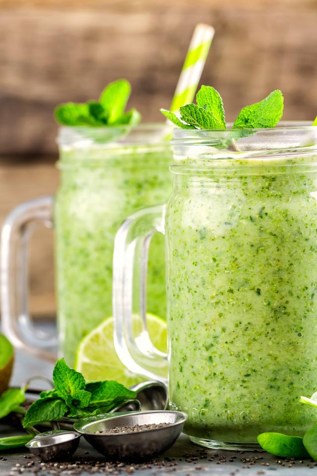 Wallpaper Two green smoothies on a table with kiwi, mint and a green apple