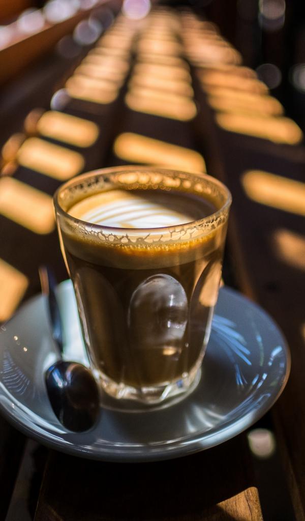 Wallpaper Glass with coffee stands on a wooden bench