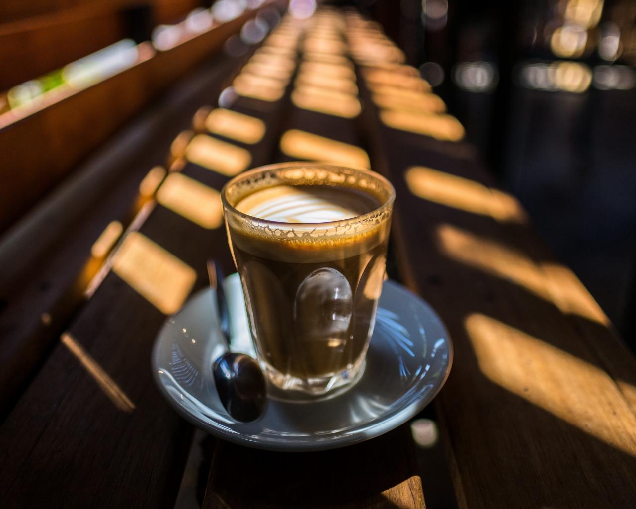 Wallpaper Glass with coffee stands on a wooden bench