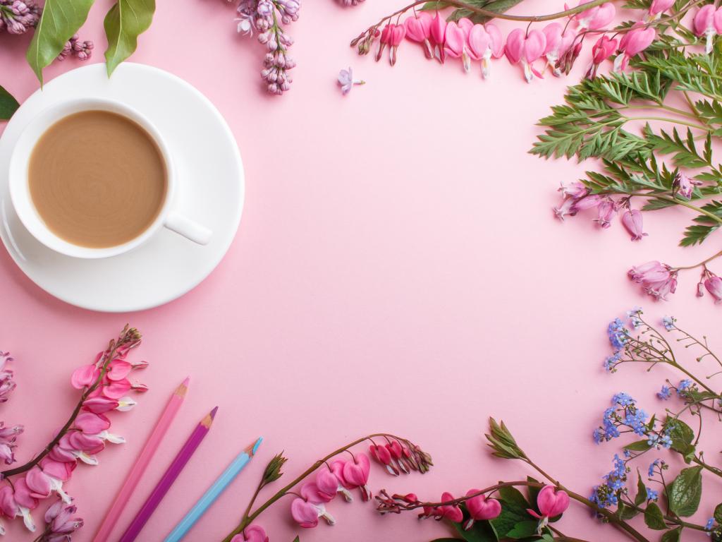 Wallpaper Cup of coffee on a pink background with flowers