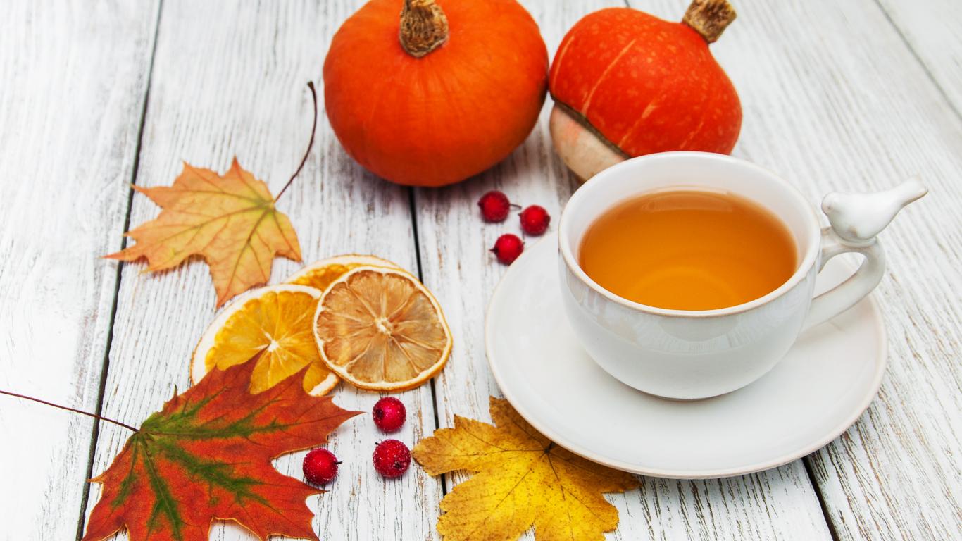 Wallpaper Cup of tea on a table with fallen leaves and pumpkin