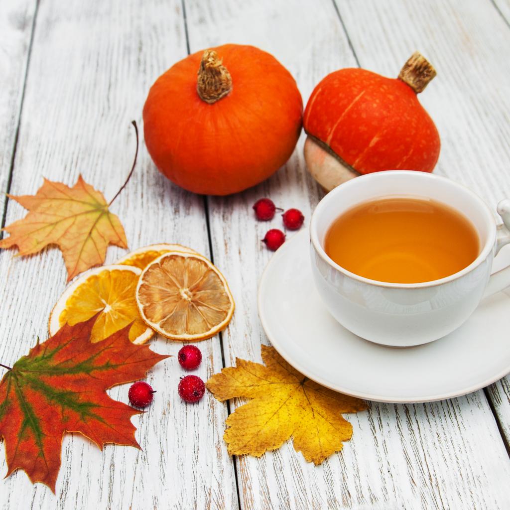 Wallpaper Cup of tea on a table with fallen leaves and pumpkin