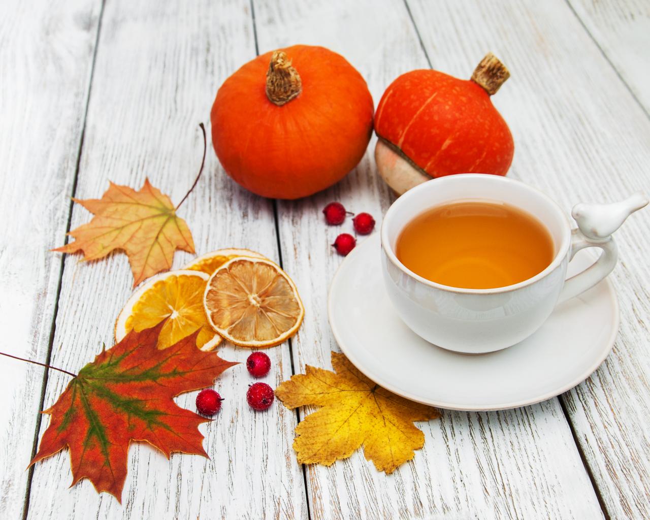 Wallpaper Cup of tea on a table with fallen leaves and pumpkin