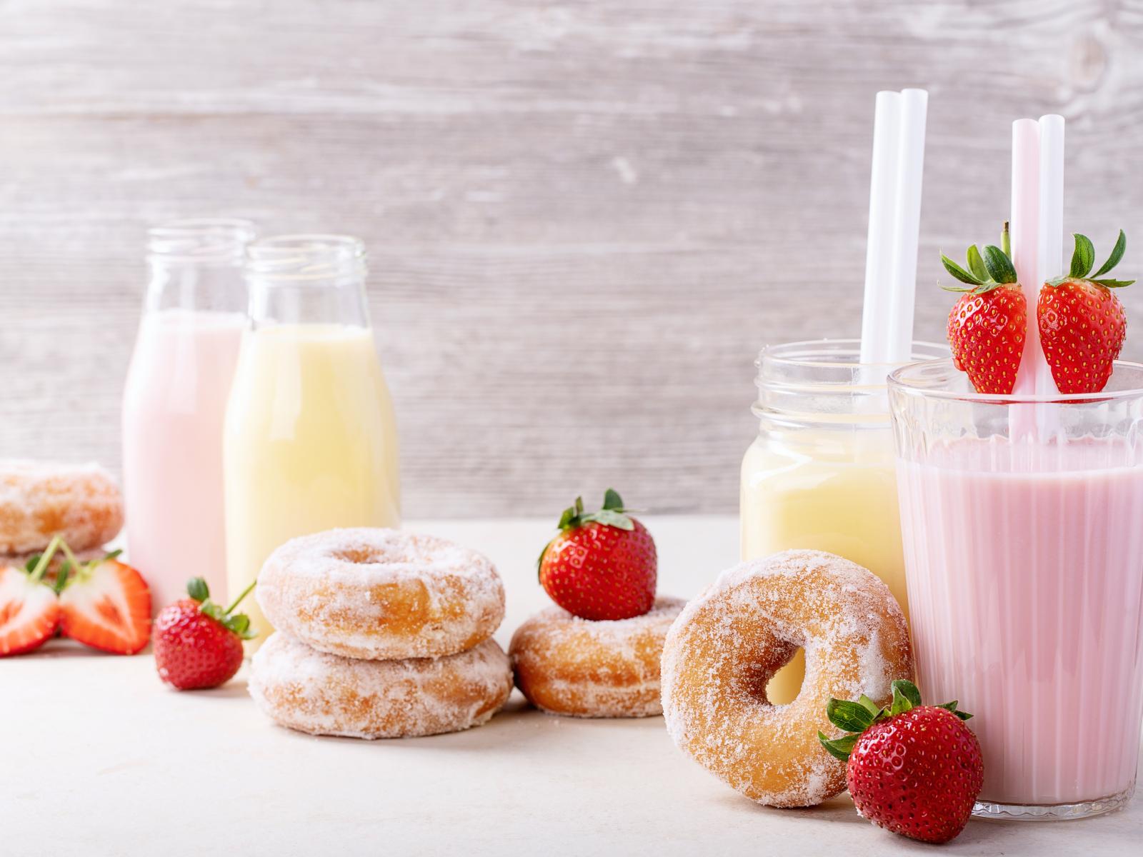 Wallpaper Milkshakes on a table with strawberries and donuts