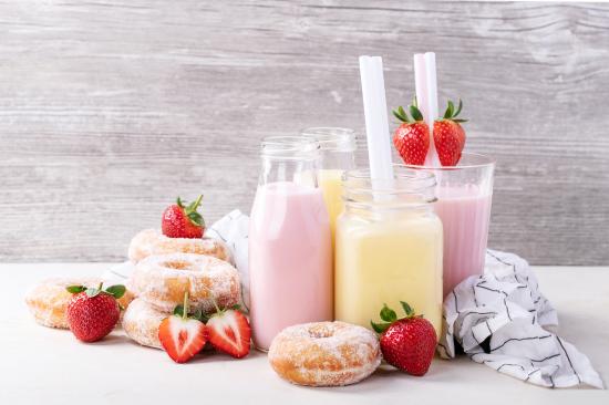 Wallpaper Milkshakes on a table with donuts and strawberries