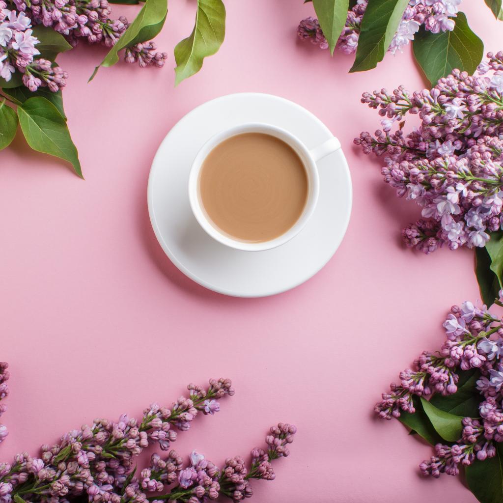 Wallpaper White cup with cocoa on a pink background with lilac flowers