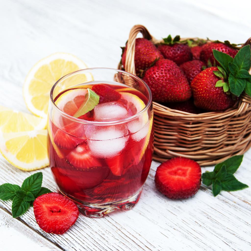 Wallpaper Cold mojito on a table with strawberries, lemon and mint
