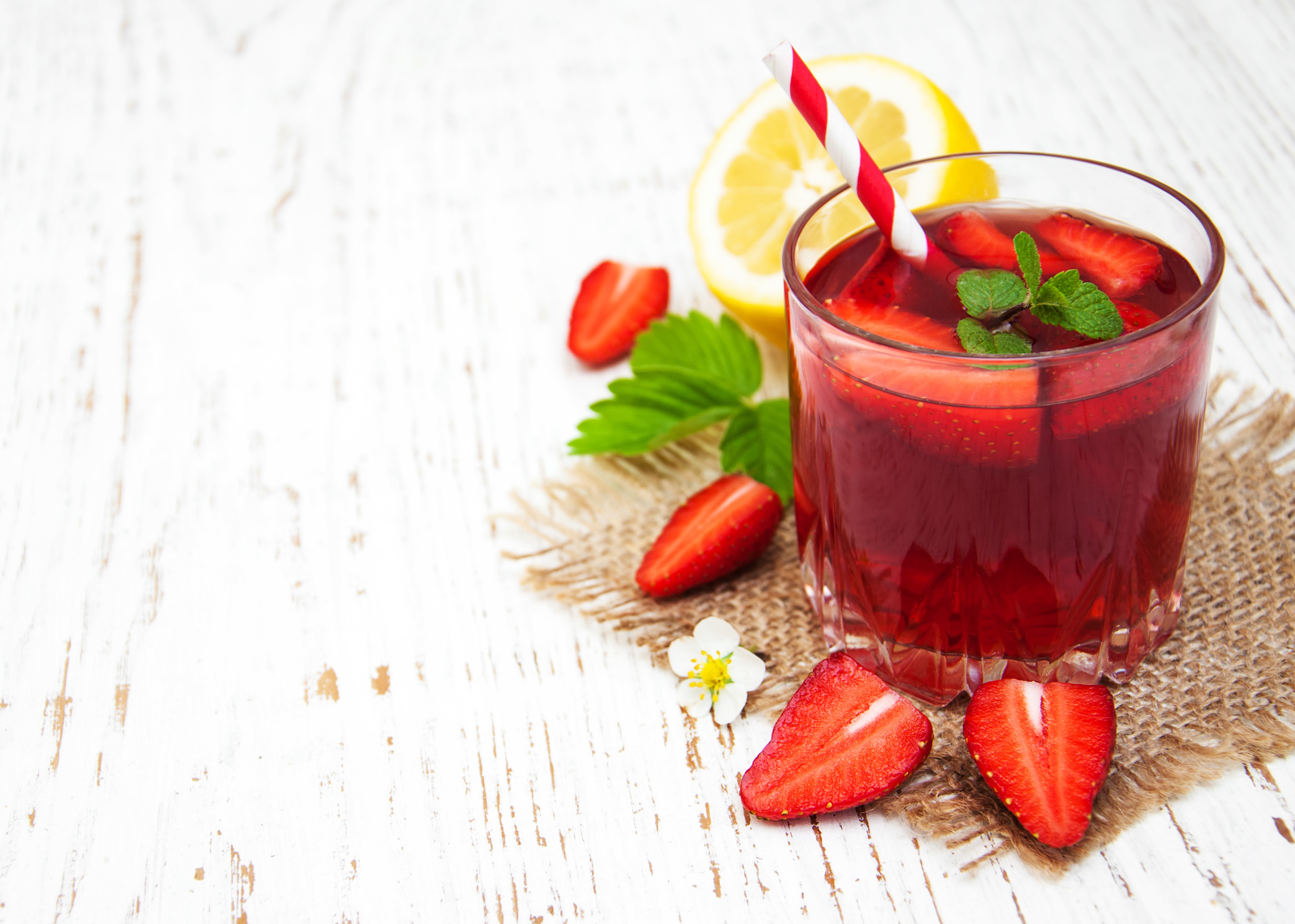 Wallpaper Drink with strawberries, lime, mint and pieces of ice on a white background